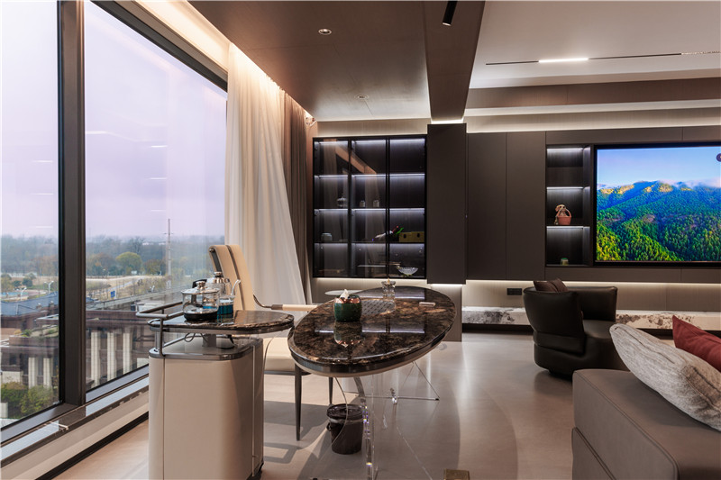 整屋科技直紋、睿智灰、黑木紋、茶白色拼接協(xié)調,突顯全屋定制的魅力。