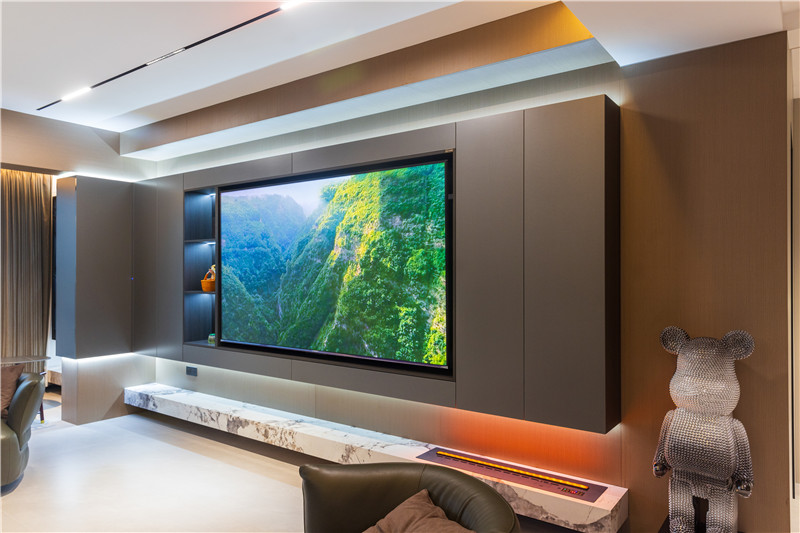 電視背景墻一體化設計,通過顏色穿插彰顯個性化;電視機嵌入柜體中,與裝飾隔層相協(xié)調,藏露結合;電視柜立體設計,墻內側嵌入燈光,以氛圍感突顯層次感。