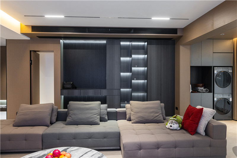 沙發(fā)背景墻為家里的動線區(qū),立柜+穿插設計貼墻而立,好看且頗顯趣味。
