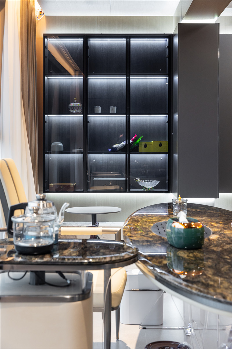 餐桌雙圓弧造型,配合以整面餐邊柜(中部掏空且預留軌道插座),木與玻璃的組合將收納力有效保障。