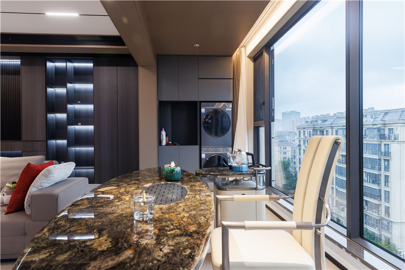 陽臺整體加入獨立式茶臺,圓弧造型盡顯高級感,沐浴陽光、品茶靜思,真是一件美事。一側小型洗衣房構造,分散家里的洗漱壓力。