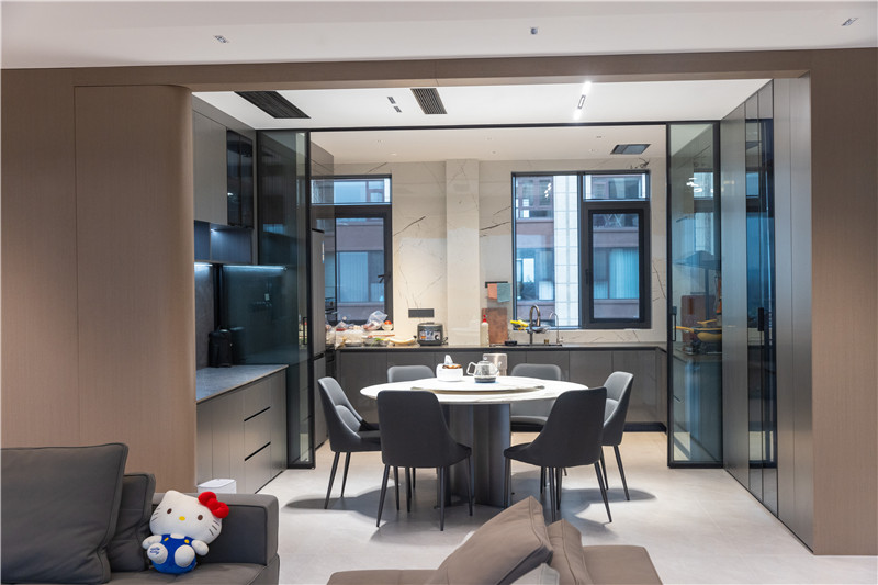 餐廚半開放式構造,以推拉門做隔斷,兼顧美學與實用性。