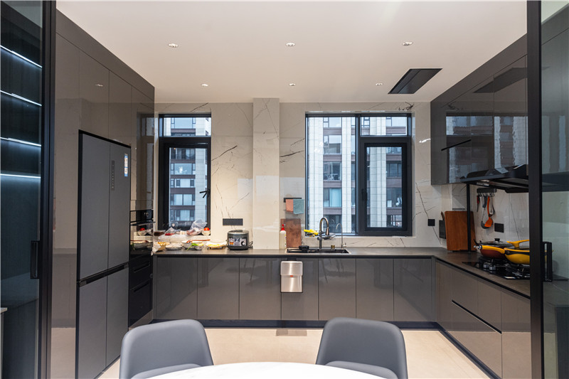 柜體以無拉手配合銑槽拉手,平整簡約;一側柜體內嵌烤箱、冰箱等電器,存儲力UP!櫥柜采用亮面門板、臺面為巖板,防水耐污能力強。