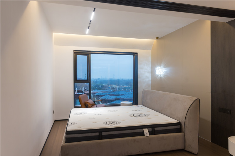 主臥床頭背景墻采用拼接設計,藝術燈光做點綴,營造出簡約純粹感;靠窗吊頂為斜坡設計,視覺上拔高層高。