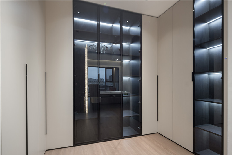 室內以夢幻玻璃磚隔出一個衣帽間,梳妝臺依屋主需求定制高度,側邊U型立柜作為收納區(qū),展示區(qū)與私密區(qū)區(qū)分,符合人體工程學設計。