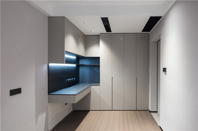 客臥兼書房使用,衣柜延伸為書桌,以懸挑設計突出特色。墻面采用了藝術漆,易擦拭,方便屋主整理清潔。