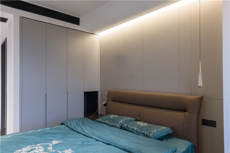 壁柜有效保障收納力、門板采用銑槽長拉手、柜體延伸為床頭柜,簡約實用;吊頂滿滿小心思,增強空間的光影感。