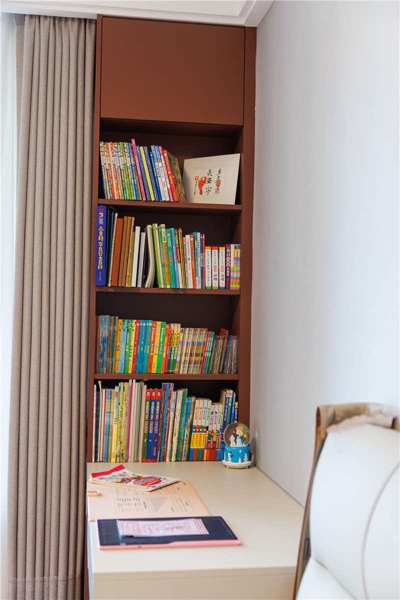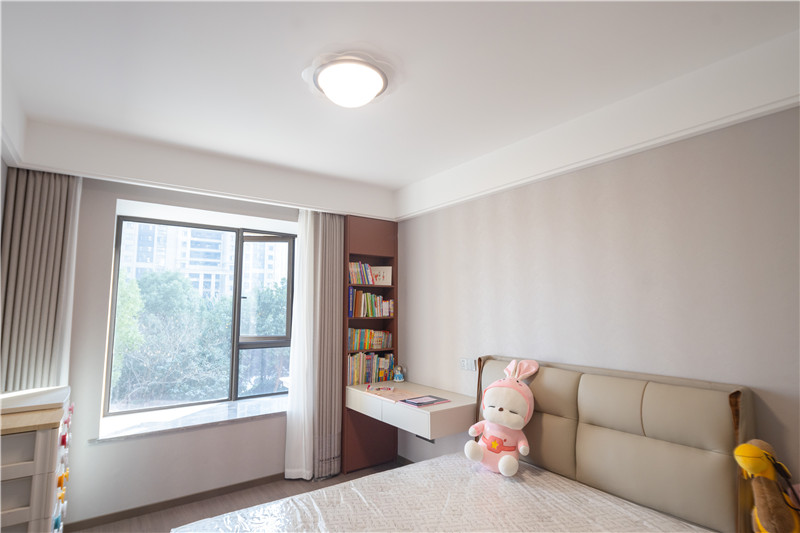 靠窗做小區(qū)域書柜,柜體延伸為床頭柜,可做書桌、梳妝臺使用;室內(nèi)柜體合理分區(qū)、飄窗區(qū)作為閑適區(qū),整體溫柔好看。