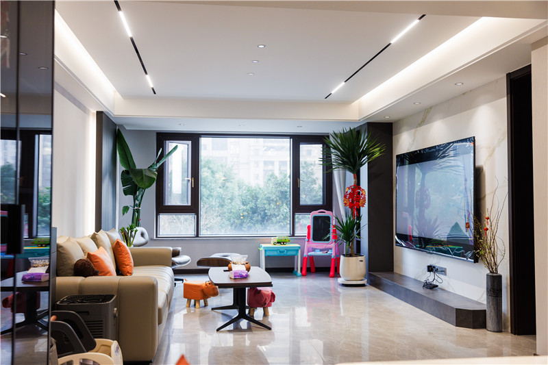 電視底座一字型底板造景平行沙發(fā),協(xié)調(diào)呼應;沙發(fā)背景墻采用整塊凸起造型板,內(nèi)嵌以燈光,無主燈設計增強空間氛圍感。