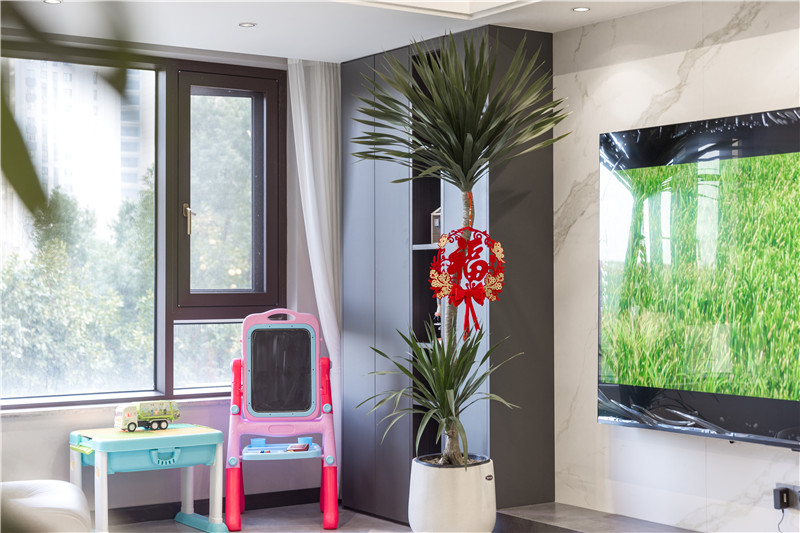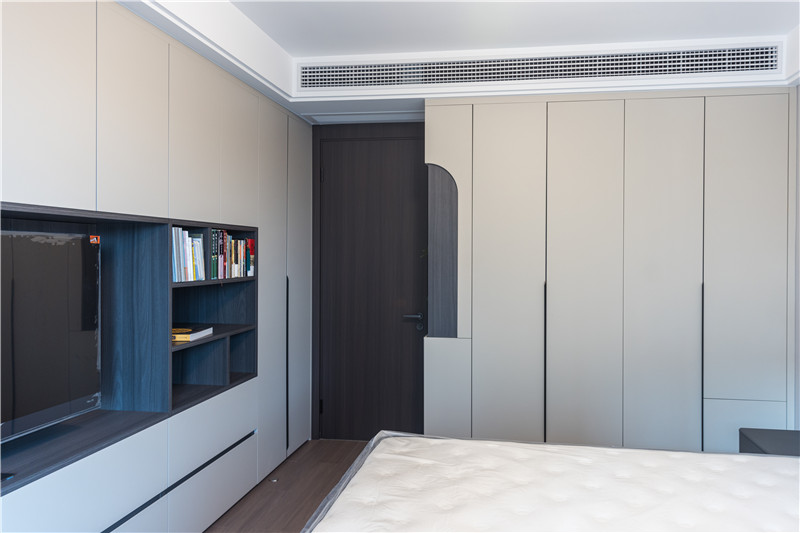 床頭整面電視背景墻為組合柜設計,藏露結(jié)合,家常放置及不常用物品收納都可在這里實現(xiàn)。