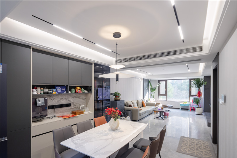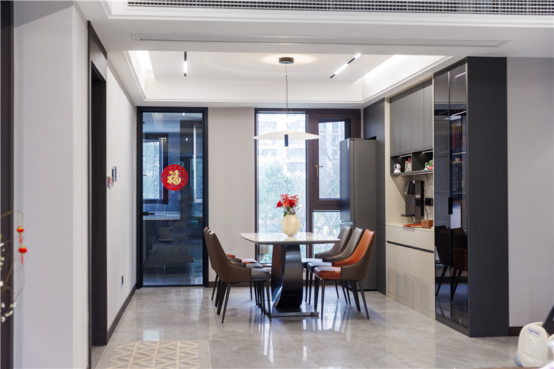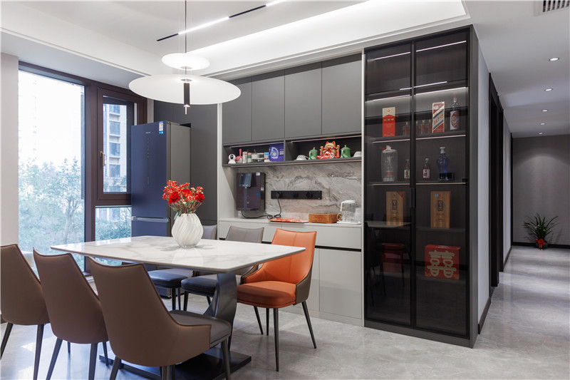 一側(cè)冰箱嵌入立柜中,視覺上協(xié)調(diào);一側(cè)設置窄邊黑框灰玻裝飾柜嵌入燈帶,是家里的風景線;餐邊柜上下柜呼應、中部加入大理石紋背板,整體與餐桌椅配套。