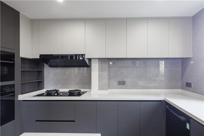 櫥柜為水洗灰門板,內(nèi)嵌烤箱等電器,節(jié)約空間;臺面巖板耐刮防滲水,臺下盆設計更方便打理;洗切烹盛動線,優(yōu)化空間。