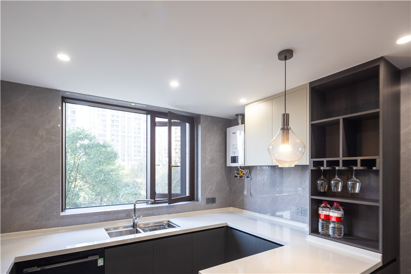 廚房整體小U型構(gòu)造,貼墻而建有效利用家里的小空間,其大窗戶有效保障室內(nèi)的采光,主燈與輔燈結(jié)合式設計,使得烹飪時視覺效果好。