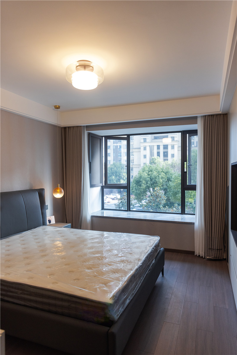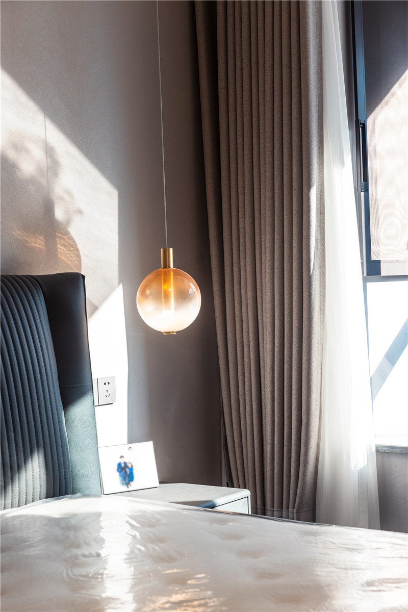 主臥水漆茶白與藍咖啡色配合,低調(diào)沉穩(wěn)且不失新意;整體主燈與藝術(shù)床頭燈配合,滿足日常起居需求;雙窗簾透光不透人,居家更安全。