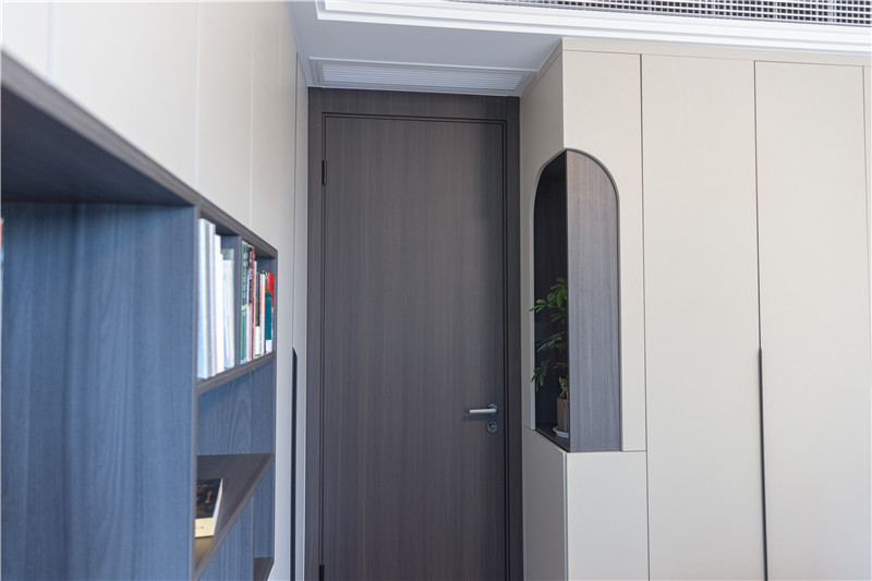 主臥進門立柜以黑色簡約長拉手突顯線條感,側(cè)邊圓弧造景展現(xiàn)高定氣質(zhì),內(nèi)部掛疊結(jié)合式設計滿足多種收納需求。
