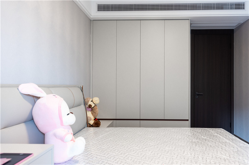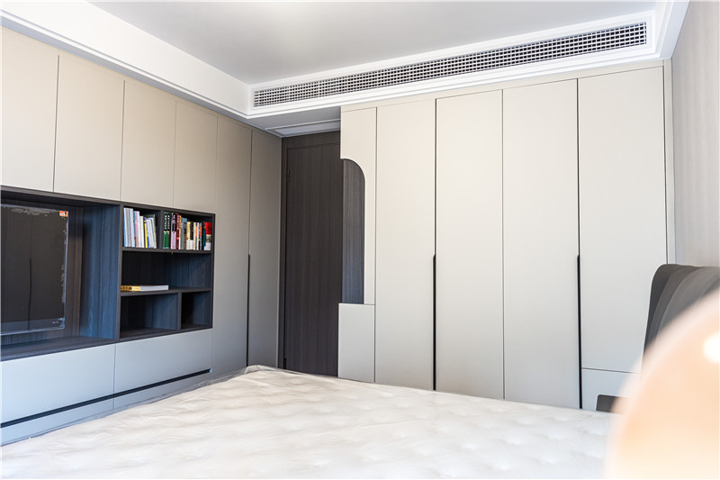 次臥滿足了功能上的生活需求,進門一字型立柜,水漆茶白門板+無拉手設計,簡約利落。
