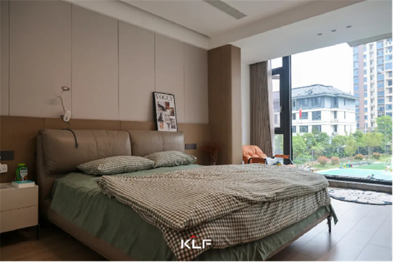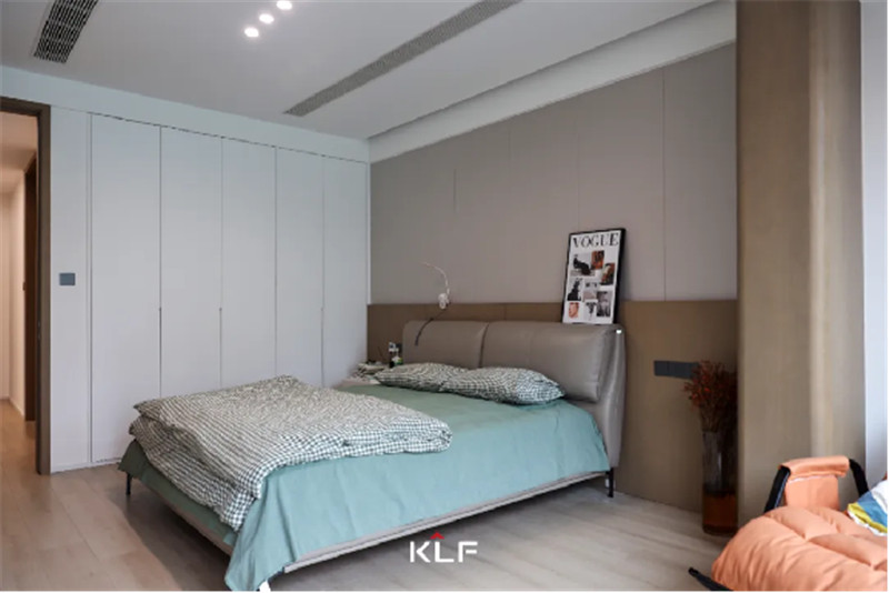 床頭背景墻與茶白衣柜組合出簡(jiǎn)約美感