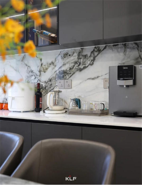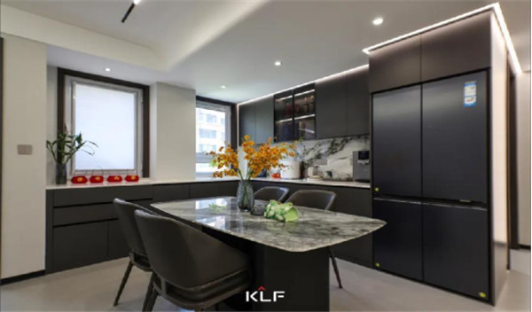 餐廳成開(kāi)放式狀態(tài),寬廣的臺(tái)面和餐椅展露空間的社交屬性,滿足親朋好友的聚餐品酒,櫥柜采用烤漆板,冰箱巧妙嵌入廚房,將精致和觸感演繹。