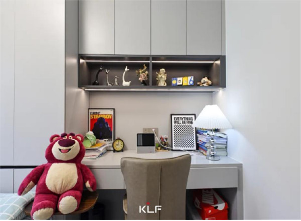 次臥空間與兒童房都在睡眠區(qū)+收納區(qū)的基礎(chǔ)上各自增設(shè)人性化定制的家居產(chǎn)品,兒童房中在床頭設(shè)計(jì)的長(zhǎng)書桌以及開(kāi)放式收納格,讓整個(gè)房間功能更為豐富。