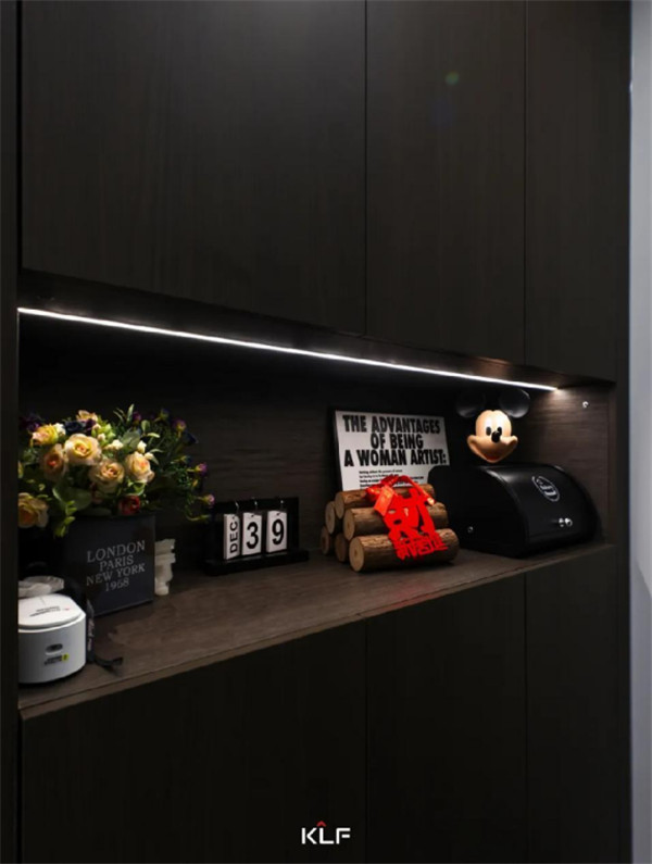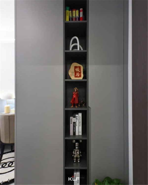 想要做到空間留白與有序收納的平衡,開(kāi)放式的開(kāi)放柜與深灰色色彩碰撞,形成不同而合的視觸覺(jué)體驗(yàn),意式極簡(jiǎn)風(fēng)之下,空間氛圍更顯寬敞。