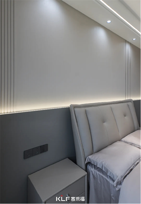 沿用了暖咖色的床頭背景墻設(shè)計(jì)