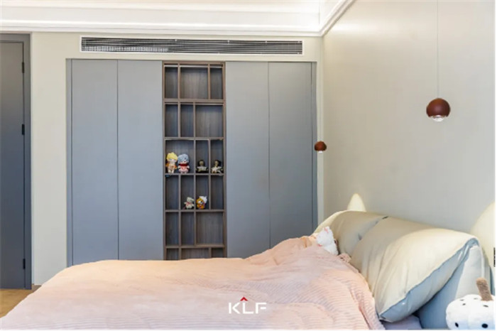 臥室設(shè)計(jì)中部不規(guī)則開(kāi)放柜,放置日常玩偶、手辦、模型等收藏品,符合使用者所需,同時(shí)為衣柜增加了精致與顏值。