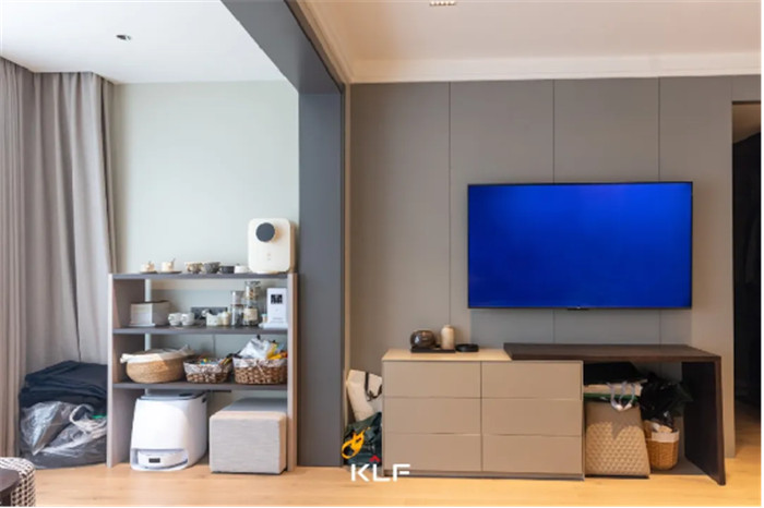 滿(mǎn)墻格柵設(shè)計(jì)增加舒適感,緩和輕奢風(fēng)帶來(lái)的疏離,讓空間更加和諧宜居,客廳無(wú)主燈設(shè)計(jì)讓空間更加寬闊明亮。