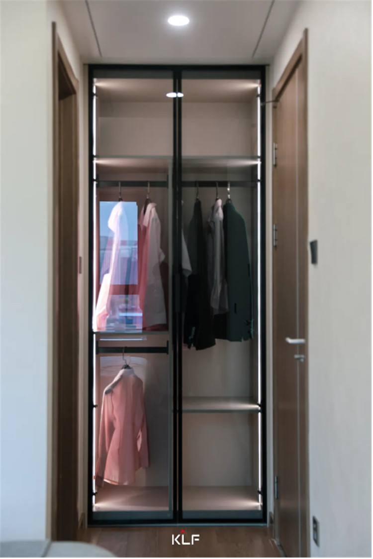 簡約的配色與簡單的衣柜設(shè)計(jì),一柜到頂式增加儲(chǔ)物能力、半銑型拉手簡潔實(shí)用,其中跳色粉套格設(shè)計(jì)既時(shí)尚又具有一番創(chuàng)意,為舒適的空間帶去一絲趣味。