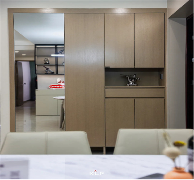 餐邊柜與護(hù)墻板色調(diào)統(tǒng)一,顯得空間和諧寬敞;玻璃吊柜內(nèi)置燈帶,既起到調(diào)節(jié)大面積茶白色帶來的素凈氛圍,又很好呈現(xiàn)輕奢風(fēng)強(qiáng)調(diào)的精致細(xì)節(jié);免拉手設(shè)計(jì)簡約實(shí)用,也減少日??呐觥?/span>