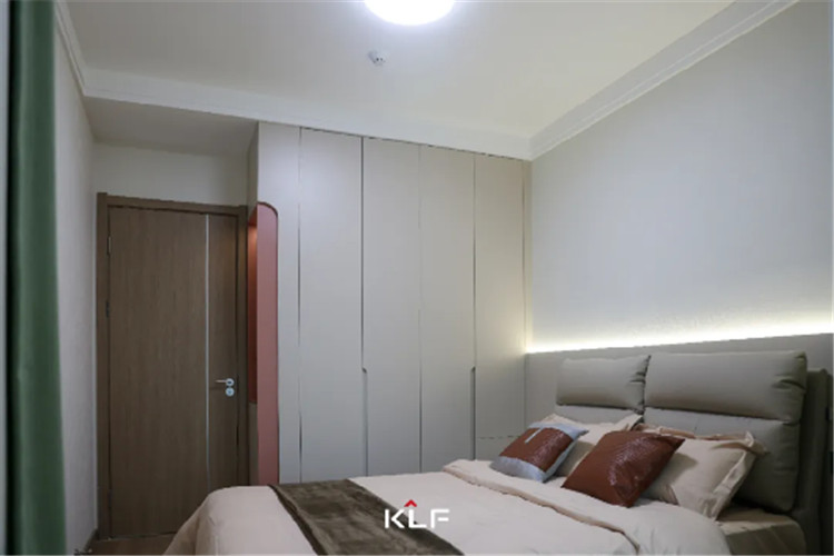 主臥一切以舒適主導(dǎo),清新淡雅的床頭背景墻營造出恬淡樸素的氛圍,見光不見燈的氛圍,讓空間又多了一份溫暖和舒適。