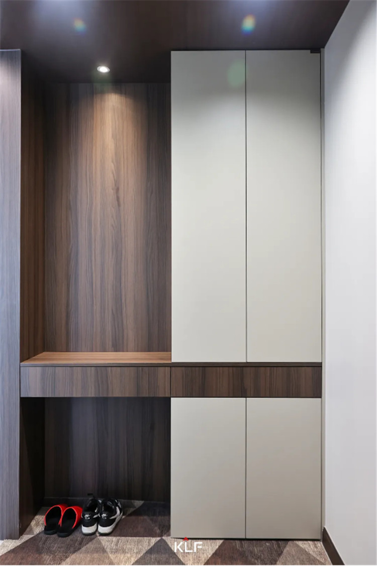 玄關(guān)造型充滿歸家的儀式感,靠墻進(jìn)門(mén)一側(cè)做穿插式設(shè)計(jì),木色與白色融合,柔和色調(diào)營(yíng)造舒適自由的居心之所。