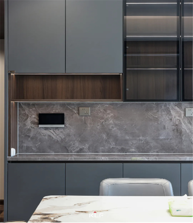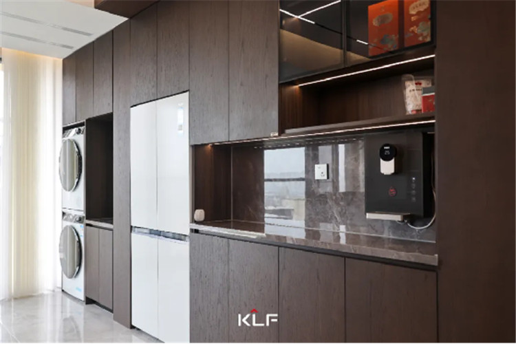 沙發(fā)背景墻被打造成整面收納柜,開(kāi)放與封閉的組合設(shè)計(jì),讓收納與展示完美融合。純木色無(wú)拉手一門(mén)到頂柜,局部選用巖板、玻璃進(jìn)行點(diǎn)綴,高級(jí)感拉滿。嵌入式設(shè)計(jì)容納了冰箱和洗衣機(jī)烘干機(jī),精簡(jiǎn)的設(shè)計(jì),給予居者更豐富的視覺(jué)感受。