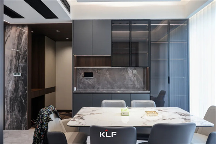 整面餐邊柜立于大理石餐桌一側(cè),儲(chǔ)物及展示功能拉滿的同時(shí),線條和形式的韻律演繹出現(xiàn)代化的家居美學(xué)。色調(diào)柔和、質(zhì)感高級(jí)的水漆柜搭配上通透玻璃,清新淡雅,營(yíng)造典雅雋永的氛圍。