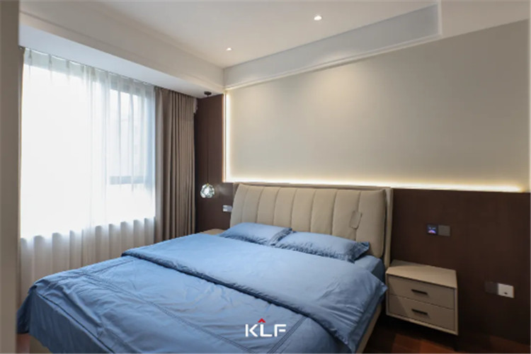 臥室沒(méi)有過(guò)多繁瑣的裝飾,床具造型簡(jiǎn)潔、線條流暢。用木質(zhì)護(hù)墻板打造半高床頭背景墻,恰到好處的留白,空間更靈動(dòng)。