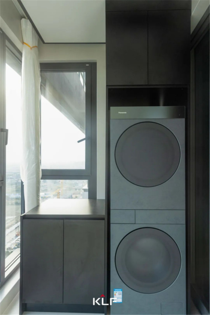 整體設計始終貫徹實用主義原則,純粹場域以留白的方式給足空間呼吸感。黑玻衣柜采用通頂設計嵌入墻體,進一步強化視覺平整度和縱深感,玻璃通透特性讓試衣與收納動線一氣呵成。