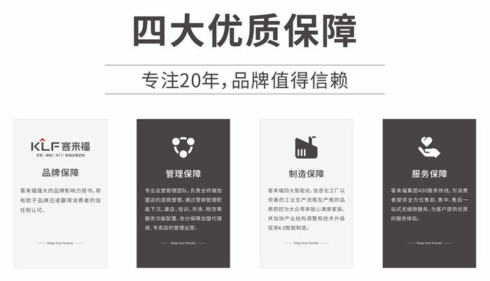 客來(lái)福專注產(chǎn)品研發(fā),在定制家居行業(yè)中力爭(zhēng)上游,是一家集研發(fā)、銷售、生產(chǎn)、售后于一體的大規(guī)模個(gè)性化定制家居品牌。如今,面對(duì)市場(chǎng)衍生出的新需求,客來(lái)福洞察新的發(fā)展機(jī)遇,以全新的商業(yè)模式,四大優(yōu)質(zhì)保障,五步無(wú)憂經(jīng)營(yíng)以及十大加盟支持,給予每一位加盟商放心、安心、良心的加盟支持,更滿足消費(fèi)者不斷變更和升級(jí)的家裝需求。