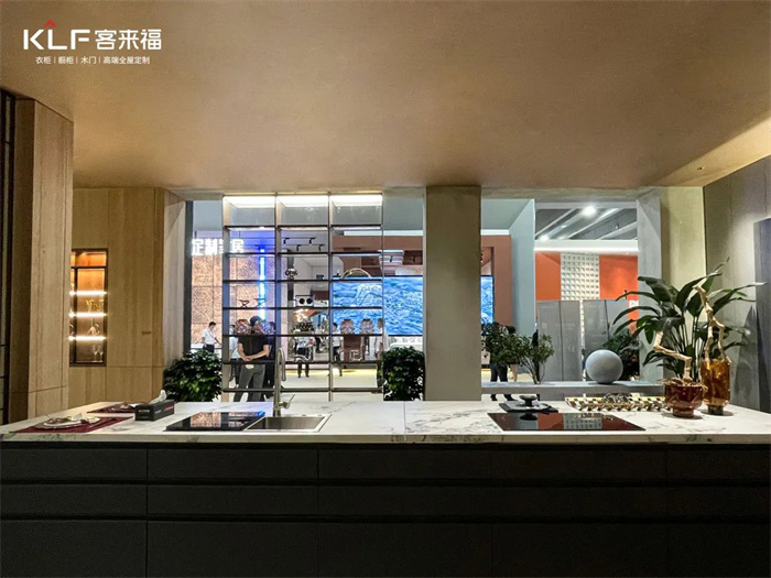 將客廳與開放式廚房打造成整體空間是升級的亮點之一,PET的工藝幫助我們實現嵌入式的內置功能,比如衛(wèi)生間的燈光和冰箱。除此之外,整家定制也是客來福今年的著力點,多功能的產品柜和開放式的設計模糊了空間界限。根據消費者對于一站式一體化的消費需求提供了解決方案。