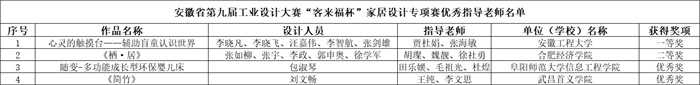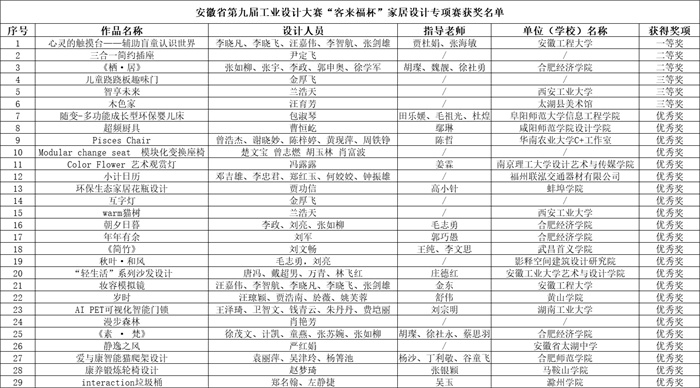 通過專項賽評審,根據(jù)評審結(jié)果,現(xiàn)將安徽省第九屆工業(yè)設(shè)計大賽“客來福杯”家居設(shè)計專項賽獲獎作品名單予以公示。