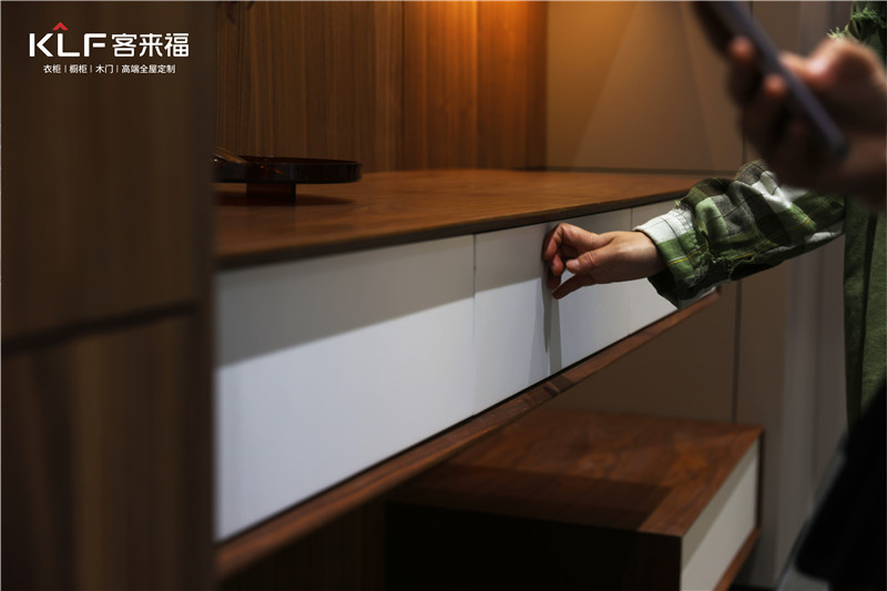 水漆工藝的運(yùn)用,使「臻·至」系列具有健康、環(huán)保的特性,從內(nèi)而外散發(fā)出高雅氣質(zhì),特有的“見木不見漆”效果在部分空間中帶來自然原生態(tài)的舒適感,折射出客來福一直踐行的健康整家定制理念。