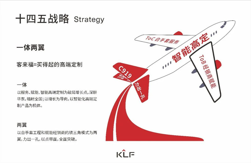在2023年,客來福更是提出了“一體兩翼”的戰(zhàn)略計劃,以智能高定為核心關鍵詞,做買的起的高端定制家居;以to b賦能經(jīng)銷商、to c白手套工程服務客戶,以點及面,全面突破。