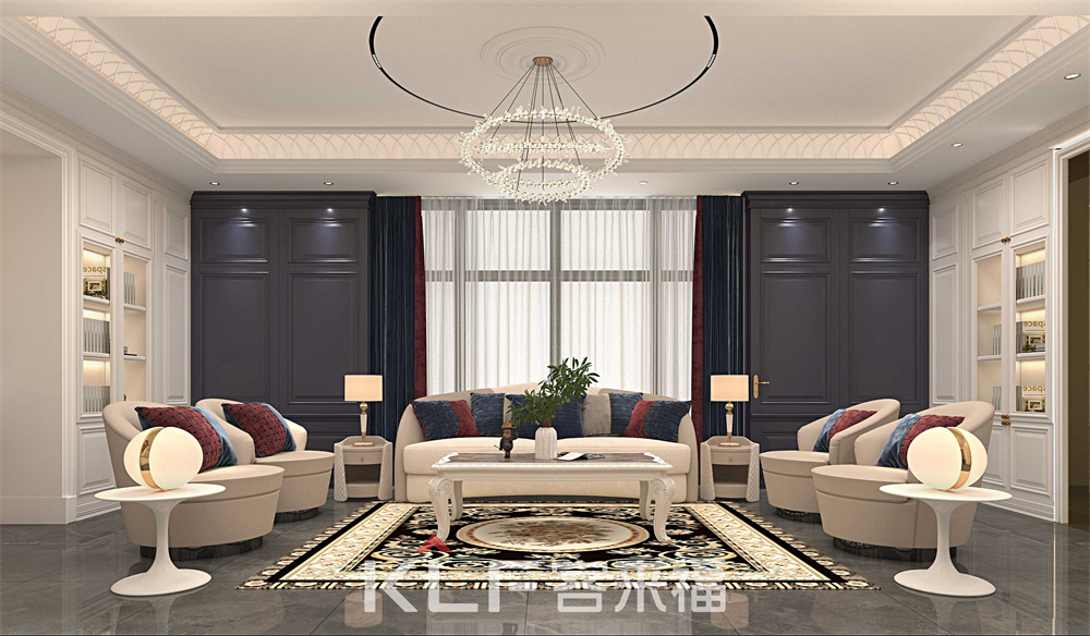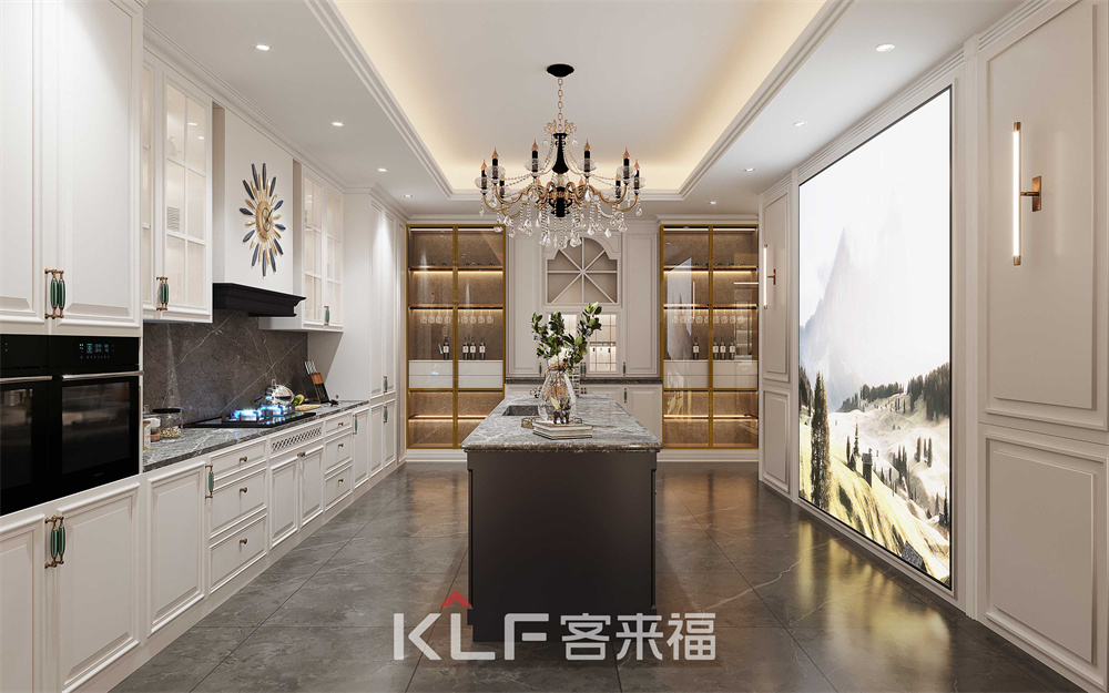 超長的中島臺,采用古典邊型的石英石臺面,灰藍色整體配色沉穩(wěn)大氣,餐邊柜采用巖板背板,是古典混搭系列的點睛之筆,客廳空間同樣采用雙色配套,壁爐柜的使用更是時下豪宅的標(biāo)配。