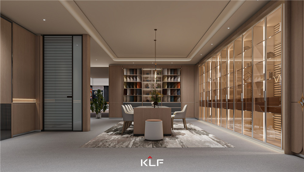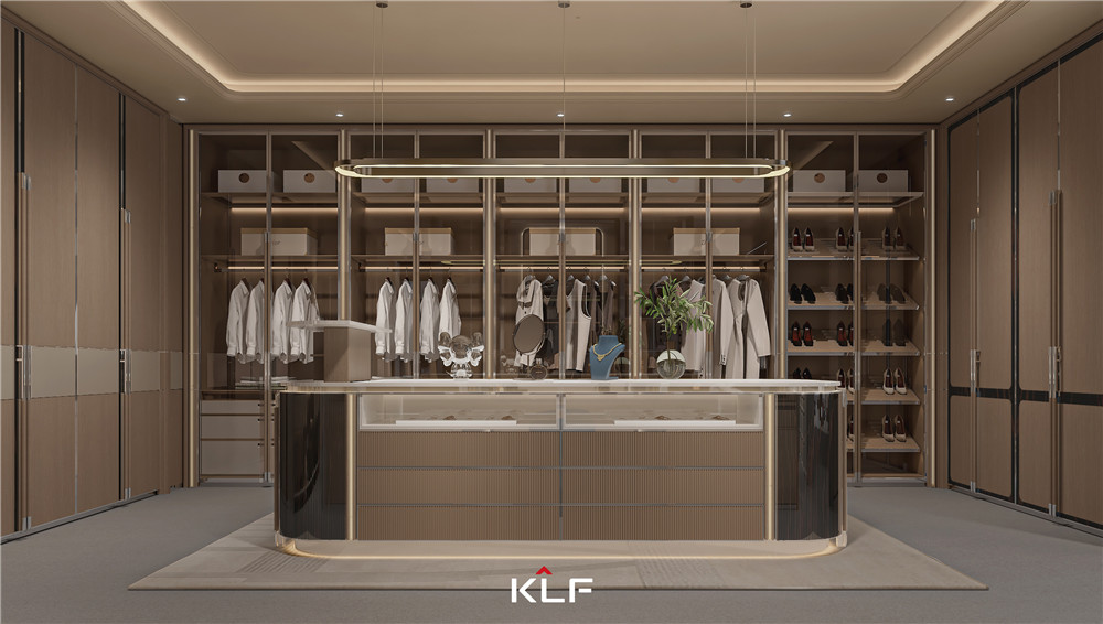 顏色上以白橡小山木紋搭配玻璃來(lái)呈現(xiàn)出輕奢,氛圍燈光渲染出柔暈光線,增加層次感;獨(dú)特的“F”品牌標(biāo)簽拉手,寓意“?!?;掛衣桿以KLF中的“K”為靈感,打造了一個(gè)具有品牌辨識(shí)度的蝴蝶掛衣桿。