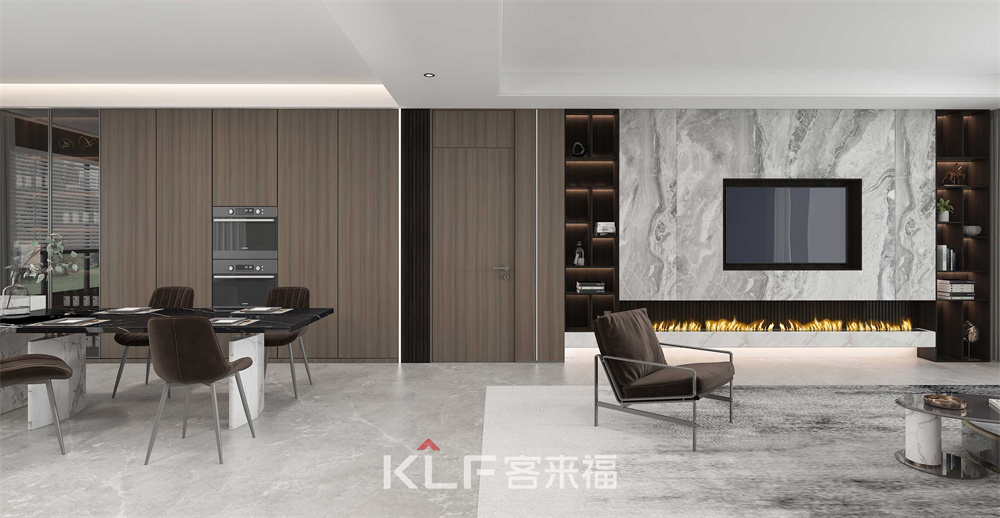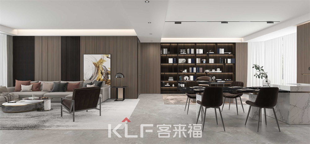 深咖色與木紋的巧妙結(jié)合,令客餐廳更顯沉穩(wěn)大氣。頂天立地柜的嵌入式與半開放式設(shè)計(jì),空間立體感油然而生。三兩親朋相聚洽談,保證輕奢格調(diào)的同時(shí)滿足你的多樣化需求。